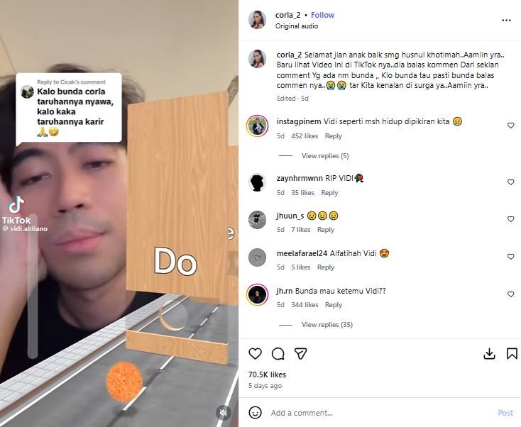 “Baru melihat video ini di TikTok-nya. Dia membalas komentar dari sekian banyak komentar yang ada nama Bunda. Jika Bunda tahu, pasti Bunda akan membalas komentarnya. Nanti kita kenalan di surga ya. Aamiin yra,” tulis Bunda Corla.