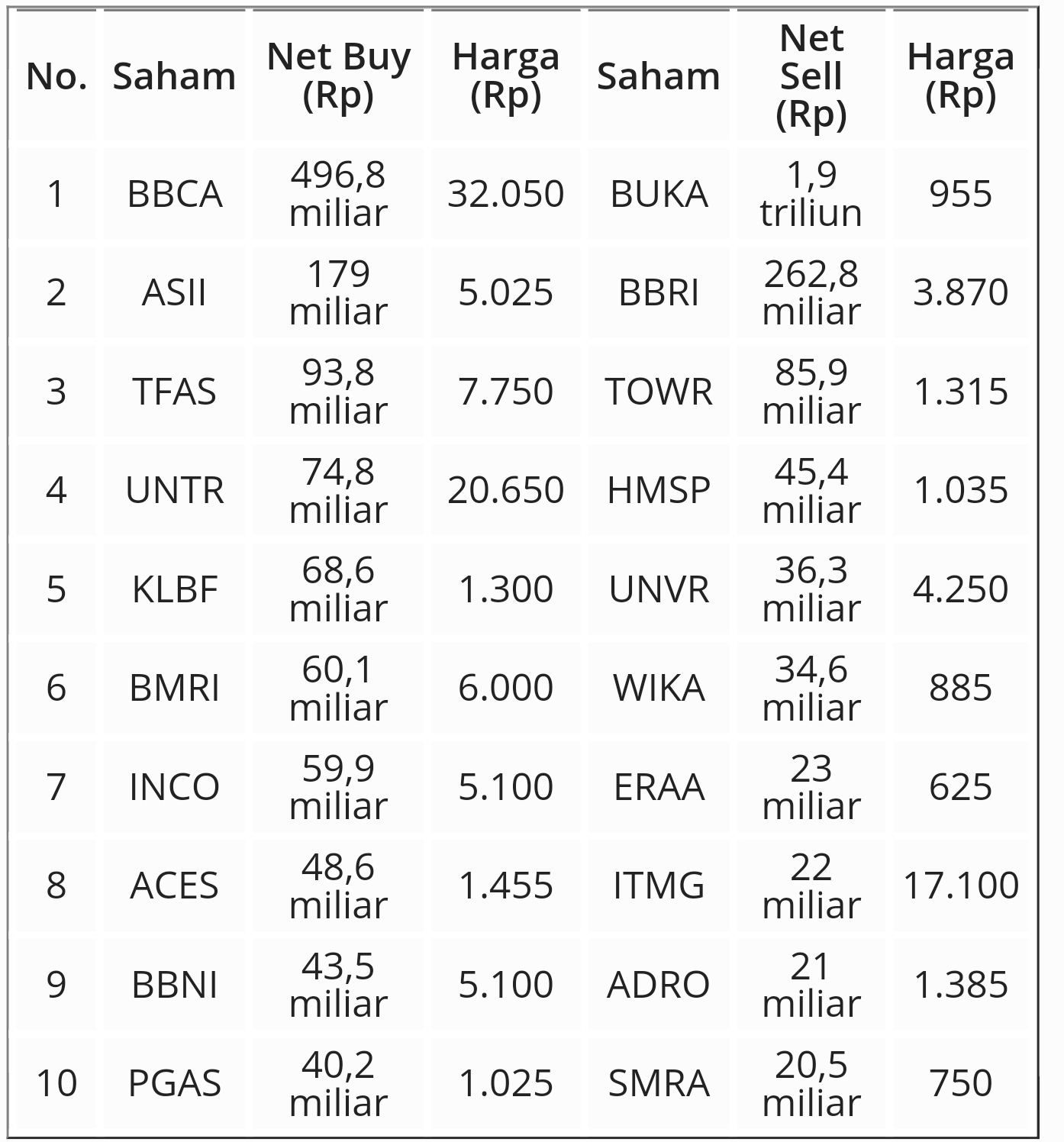 Ada yang Naik 106 Persen! Aksi jual bersih juga tercatat pada saham PT Sarana Menara Nusantara Tbk (TOWR) sebenar Rp85,9 miliar dan PT HM Sampoerna Tbk (HMSP) senilai Rp45,4 miliar.