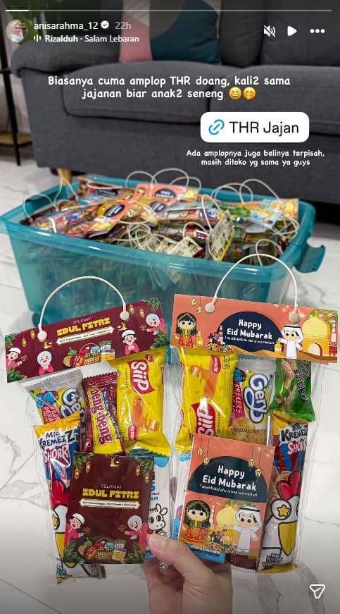 Anisa Rahma tidak hanya memberi amplop THR, tetapi juga menyiapkan bingkisan snack untuk anak-anak. Ini menunjukkan kepeduliannya terhadap generasi muda saat Lebaran.